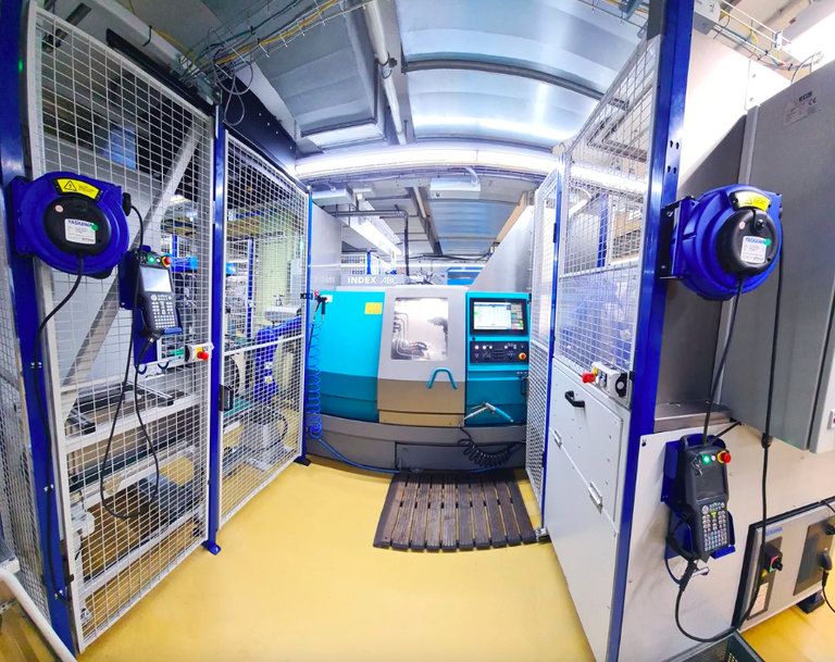 After these processing steps, the workpiece carriers are returned to the first robot via the transfer system. In the transfer system, they are turned and automatically transferred to the transfer shuttle at the input of the index lathe, which feeds them to the machine.